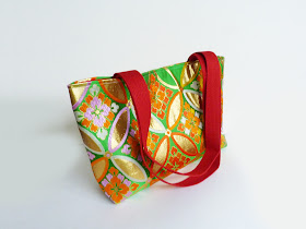 On Monday I mentioned some obi fabric that I was going to make up into a new tote bag, well here's the end result! A rather stunning bag made from a multi coloured vintage Japanese obi fabric. I think it makes quite a statement and would compliment any outfit - use it as a bag to go shopping, or to dress up an outfit for a night out. It's big enough to fit all the essentials and has a magnetic snap closure to keep the bag closed. This would also make a wonderfully unique gift item.